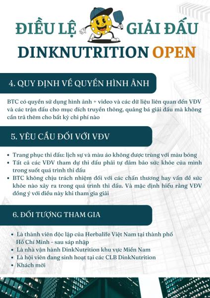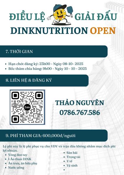 Pickleball đang nóng hơn bao giờ hết! Và lần đầu tiên tại Hồ Chí Minh, DINKNUTRITION chính thức tổ chức GIẢI ĐÂU DINKNUTRITION OPEN LẦN I, hứa hẹn mang đến những trận cầu kịch tính, những pha bóng đẹp mắt và tinh thần thể thao bùng nổ!